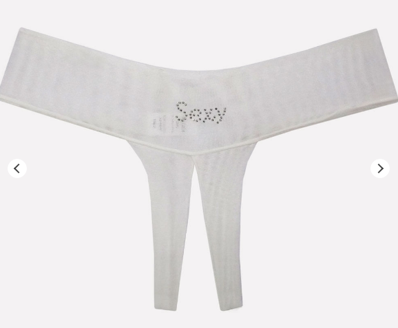 Detalhe: Fita cruzada na traseira e a palavra "SEXY" na frente.