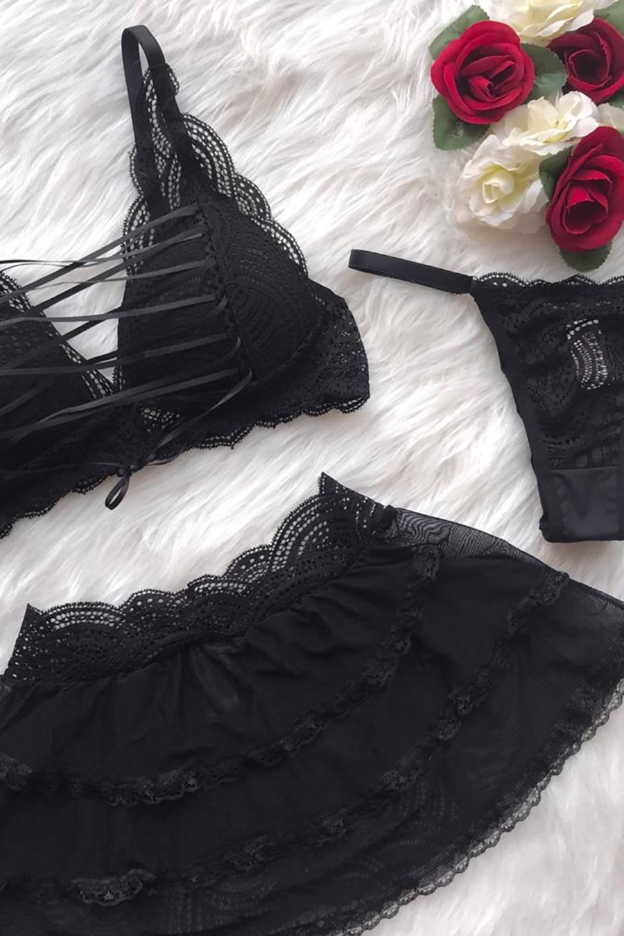 A saia levanta bumbum é feita em tule e renda, sendo uma opção versátil e sedutora. Ela é projetada para realçar a silhueta e valorizar as curvas do corpo, especialmente a região do bumbum. O tule e a renda utilizados na saia conferem um toque sensual e elegante, tornando-a uma adição atraente ao conjunto.