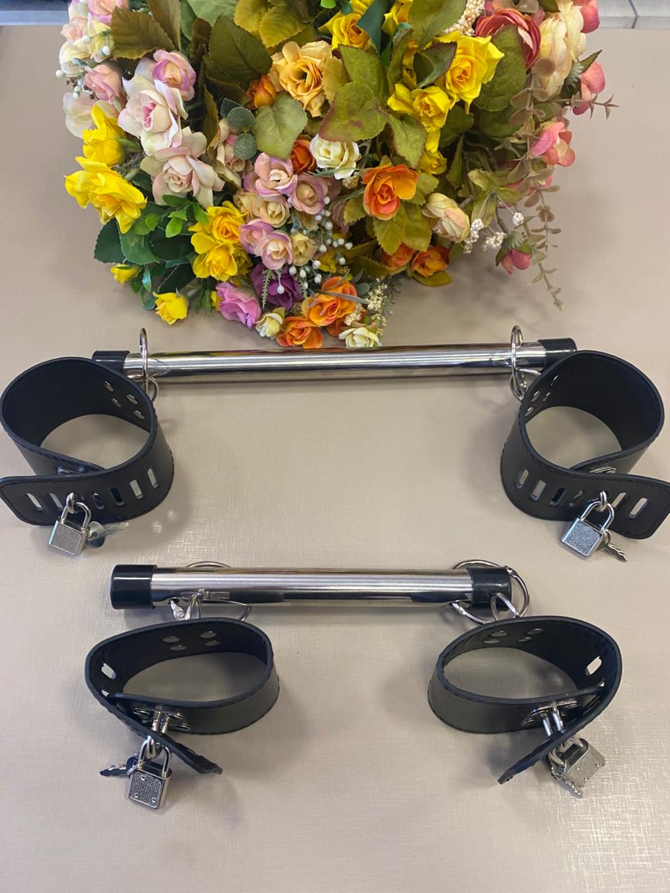 Estes dois pares de algemas em nylon unem os punhos e os tornozelos por uma barra de aço super-resistente.