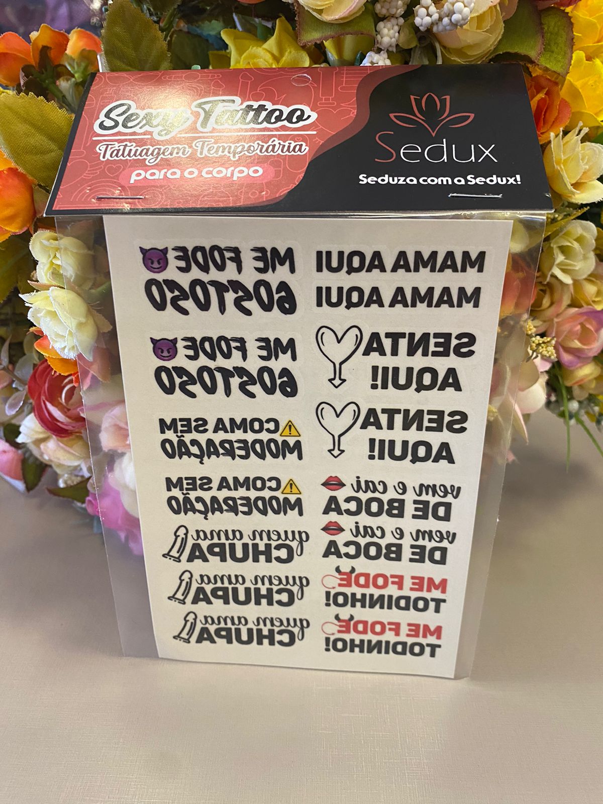 Mama Aqui, a tatuagem removível da Sedux é perfeita para esquentar seus instantes de prazer, acompanha 15 desenhos, dura entre um até dois dias, é de fácil remoção, é temporária, não é tóxica e nem alérgica!